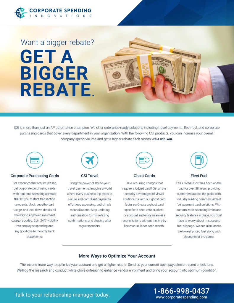 Met with department head to discuss key elements to include on this overview as it would be handed out at trade shows that CSI would be attending. Rebates were determined to be a key selling point in attracting new business so I researched compelling imagery. I also knew going forward we would be making more of these overviews so I decided it would also be wise to come up with a brand template version so that for future requests, the only elements that would need to be updated would be the header and interior content.
